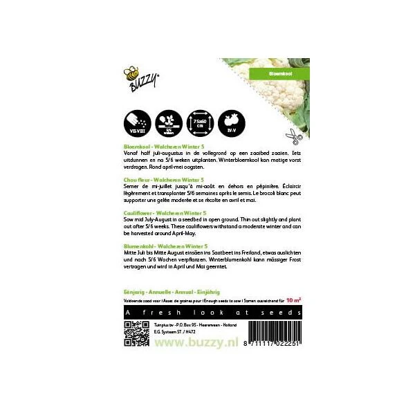 Bloemkool Walcheren Winter is een sterke bloemkool voor de late (winter)teelt. De planten verdragen tot – 10°C vorst en herstellen zich daarna uitstekend. De planten blijven de hele winter op het land staan. De bloemkolen vormen zich in het voorjaar.