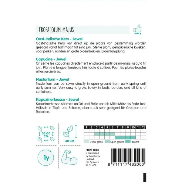 Oost-Indische kers (Tropaeolum majus) ‘Jewel’ kan direct op de plaats van bestemming worden gezaaid vanaf half maart tot eind mei. Heel sterke plant die gemakkelijk te kweken is voor borders, bakken of randen.