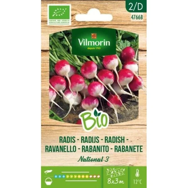 Kweek zelf biologische radijsjes in jouw moestuin met de BIO zaden van Vilmorin. Radijs National 3 is een traditionele variëteit die lang zijn smaak behoudt. Ze hebben een milde smaak, zijn mooi rond van vorm en hebben een fris wit/vermiljoenrode kleur.