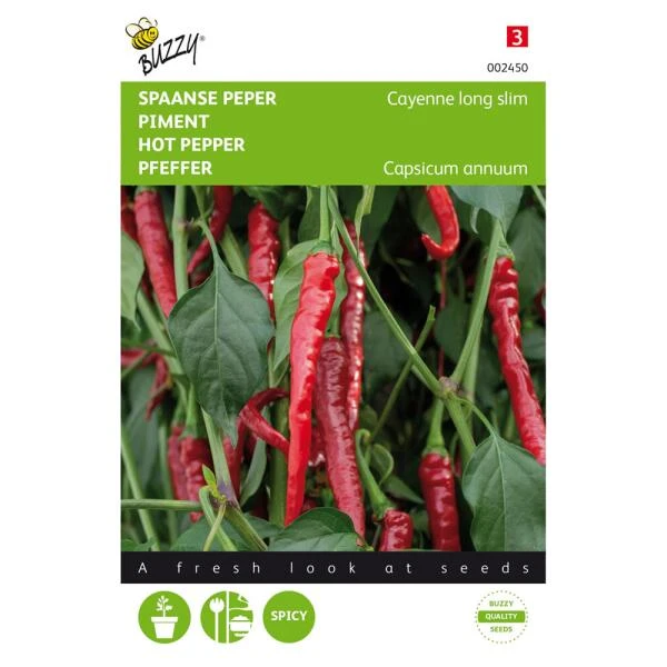 Pepers De Cayenne is een pittige (Spaanse) rode peper. In onrijp stadium zijn de vruchten nog groen van kleur, maar daarna worden ze vuurrood. Ze zijn lekker te verwerken in tal van scherp smakende schotels als chili con carne en Indonesische gerechten. ‘De Cayenna’ kan uitstekend op de koude grond gekweekt worden.