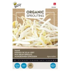 Taugé kan het hele jaar door gekweekt worden als spruitgroente in een sprouting pot. Je hebt er geen tuin voor nodig, geen groene vingers en je hebt snel resultaat! Strooi een lepel zaad in de kweekpot, voeg ruim lauw water toe en draai het deksel erop. Giet het overtollige water af. Zet de kweekpotten in het afdruiprek bij een temperatuur van ca. 20°C. Spoel 2 à 3 keer per dag en na ongeveer 6 dagen is de taugé klaar voor consumptie.